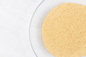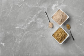 Widok z góry misy z surowego proszku korzenia maka na jasnoszarym tle z miejsca kopiowania