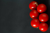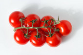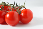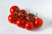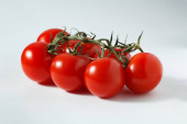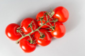 pomidory wiśniowe na łodydze, pomidory wiśniowe na białym tle.