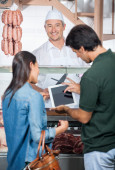 Szczęśliwy człowiek na połączenie podczas kobieta kupno mięsa
