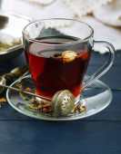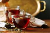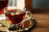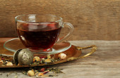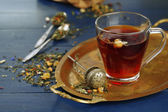 Piękny starodawny skład z herbaty ziołowe, na drewnianym stole