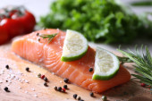 Świeży łosoś z przyprawami i cytryny na drewnianym stole