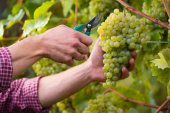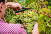 Młody człowiek, plantatora winorośli, zbioru winogron w winnicy.