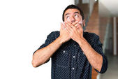 młody przystojny biały mężczyzna odizolowany na zielony chroma tło szczęśliwy i uśmiechnięty pokrycie usta z rąk