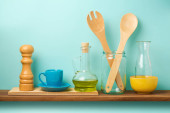 Zdjęcie "Przybory Kichen i filiżanka kawy na drewnianej półce. Boże Narodzenie i Nowy Rok wakacje makieta do projektowania" może być wykorzystywane do celów osobistych i komercyjnych zgodnie z warunkami zakupionej licencji Royalty-free. Obraz jest dostępny do pobrania w jakości wysokiej rozdzielczości do 5760x3840.