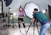 Profesjonalna modelka pozująca podczas sesji zdjęciowej z białym fotografem