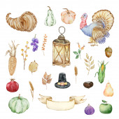 Święto Dziękczynienia elementy akwareli, narożniki obfitości, latarnia i dynie izolowane