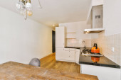 Nowoczesny minimalistyczny styl wnętrza jasny apartament typu studio z drewnianym stołem i krzesłami w strefie jadalnej między otwartą kuchnią i salonem z białymi ścianami i parkietem
