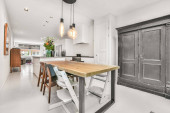 Zdjęcie "Nowoczesny minimalistyczny styl wnętrza jasny apartament typu studio z drewnianym stołem i krzesłami w strefie jadalnej między otwartą kuchnią i salonem z białymi ścianami i parkietem" może być wykorzystywane do celów osobistych i komercyjnych zgodnie z warunkami zakupionej licencji Royalty-free. Obraz jest dostępny do pobrania w jakości wysokiej rozdzielczości do 5760x3840.