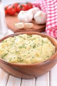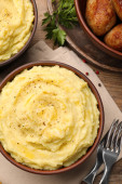 Miska świeżo ugotowanych ziemniaków puree z pietruszką podana na drewnianym stole