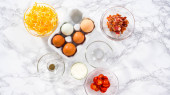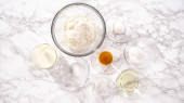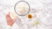 Leżeć płasko. Cytrynowe ciasteczka z cytrynową polewą. Zmierzone składniki w szklanych miseczkach do przygotowania ciasteczek z klina cytrynowego.