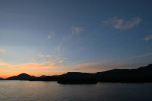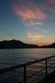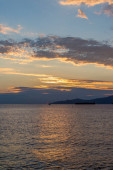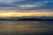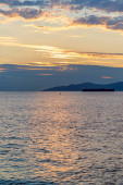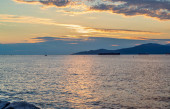 Zachód słońca na morzu przed Vancouver z kontenerowcami, żaglówką i wiosłami stand-up