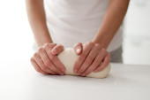 Mężczyzna ugniatający ciasto przy stole w kuchni, zbliżenie