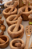 Stań na targu ulicznym sprzedając drewniane naczynia kuchenne jako miski, chochle i sztućce
