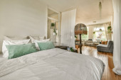 Zdjęcie "Home wystrój wnętrz sypialni z łóżkiem i drewnianą szafą umieszczone w rogu w pobliżu okna w nowoczesnym apartamencie" może być wykorzystywane do celów osobistych i komercyjnych zgodnie z warunkami zakupionej licencji Royalty-free. Obraz jest dostępny do pobrania w jakości wysokiej rozdzielczości do 5760x3840.
