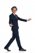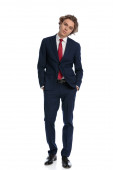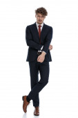 widok z boku pewny siebie młody biznesmen skrzyżowanie ramion i pozowanie, w granatowym garniturze z czerwonym krawatem i stoi przed białym tle, pełne ciało