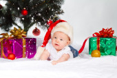 Mikołaj. Tło choinki. Szczęśliwego Nowego Roku! Dziecko w kapeluszu Mikołaja