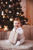 Mikołaj. Tło choinki. Szczęśliwego Nowego Roku! Dziecko w kapeluszu Mikołaja