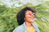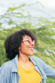 Portret Latynoska kobieta patrząc w aparat podczas pozowania na naturalnym zielonym tle.