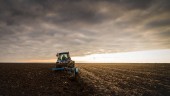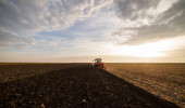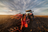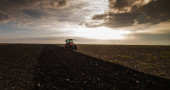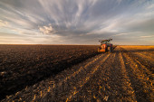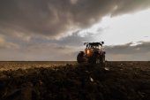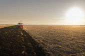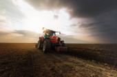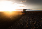 ciągnik zaoruje pole wieczorem o zachodzie słońca.
