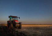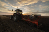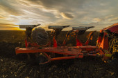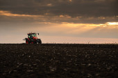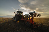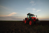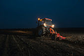 ciągnik zaoruje pole wieczorem o zachodzie słońca.