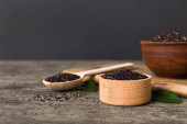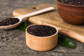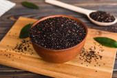 nasiona komosy w misce i łyżce na kolorowym tle. Zdrowa kinwa w małej misce. Zdrowa superżywność.