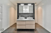 Zdjęcie "Nowoczesny wystrój wnętrz białych łazienek z otwartą wanną i prysznicem oddzielonych od toalety ścianką działową" może być wykorzystywane do celów osobistych i komercyjnych zgodnie z warunkami zakupionej licencji Royalty-free. Obraz jest dostępny do pobrania w jakości wysokiej rozdzielczości do 5760x3840.