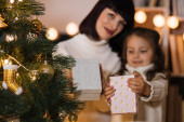Matka i córka trzymają dekoracje na choinkę. Stylowe wnętrze pokoju dziecięcego. Skandynawski wystrój ekologiczny. Święto Nowego Roku. Wigilia. Wspierać wspólne przekazywanie czasu. miłość