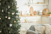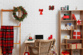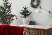 Piękne choinki w garnku na stole w pobliżu białej cegły ściany