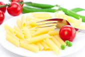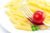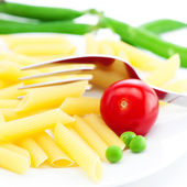 pomidory, groch, makaron i widelec na płytce na białym tle