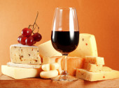 ser, wino i inne smaczne rzeczy na drewnianym stole
