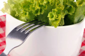pomidorów i sałaty z widelcem na płytce na białym tle