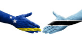 Uścisk dłoni między Bahamami a flagami Wysp Marshalla namalowanymi na dłoniach, odizolowany przezroczysty obraz.