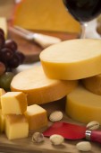 ser, wino i inne smaczne rzeczy na drewnianym stole