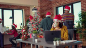 Uroczysta kobieta rozmawiająca na internetowej konferencji wideokonferencyjnej z kolegami, uczestnicząca w internetowym spotkaniu telekonferencyjnym w biurze ozdobionym choinką i światłami. Wideokonferencja zdalna.