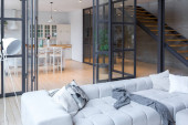 Wnętrze nowoczesnego salonu z wygodną sofą i drewnianym stołem w mieszkaniu