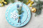 Boże Narodzenie tabeli Ustawienia w niebieski, złoty i whitec olory na obrus szary tło