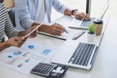 Zdjęcie "Portret sprzedawczyni i sprzedawcy płci męskiej omawiający sposoby zwiększenia sprzedaży poprzez inwestowanie w nowe produkty w celu rozszerzenia marketingu przy użyciu dokumentów i komputerów w pracy, nowy produkt pomysłu." może być wykorzystywane do celów osobistych i komercyjnych zgodnie z warunkami zakupionej licencji Royalty-free. Obraz jest dostępny do pobrania w jakości wysokiej rozdzielczości do 5760x3840.