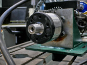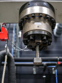 Zbliżenie płyt ściskających na stanowisku ściskającym do badań mechanicznych.