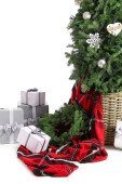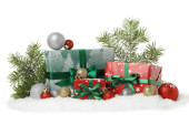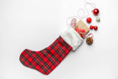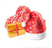 Santa torba pełna prezentów i dekoracji na białym tle