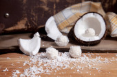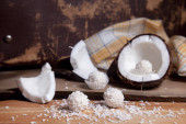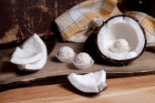 Zdjęcie "Zamknij słodko-czekoladowe trufle kokosowe i kokosowe z białą miazgą, chipsami kokosowymi. Biała czekolada słodycze kokosowe i łupiny kokosowe, płatki kokosowe, małe kawałki rozbitego orzecha, chipsy kokosowe na drewnianym tle." może być wykorzystywane do celów osobistych i komercyjnych zgodnie z warunkami zakupionej licencji Royalty-free. Obraz jest dostępny do pobrania w jakości wysokiej rozdzielczości do 5760x3840.