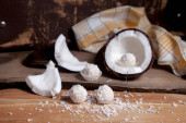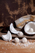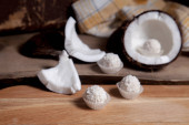 Zamknij słodko-czekoladowe trufle kokosowe i kokosowe z białą miazgą, chipsami kokosowymi. Biała czekolada słodycze kokosowe i łupiny kokosowe, płatki kokosowe, małe kawałki rozbitego orzecha, chipsy kokosowe na drewnianym tle.