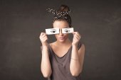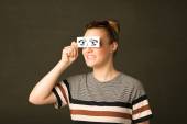 Szczęśliwa dziewczyna patrząc z ręcznie rysowane okulary papierowe oko