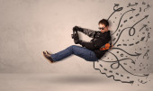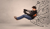 Zabawny człowiek jazdy pojazd latający z ręcznie rysowane linie po h