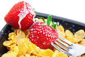truskawka, mleka, widelec i płatków w misce na białym tle