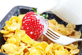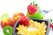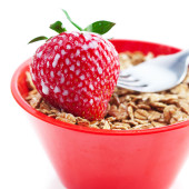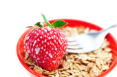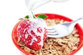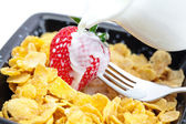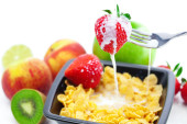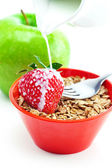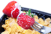 truskawka, mleka, widelec i pszenicy w misce na białym tle