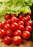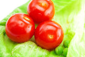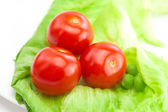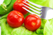 pomidor, groszek i sałata na płytce na białym tle