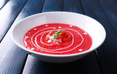 Gazpacho çorbası renkli ahşap zemin üzerinde
