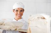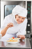 Szczęśliwy szef toczenia arkusz makaronu na licznik
