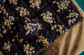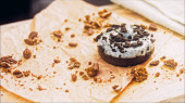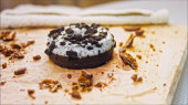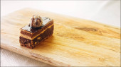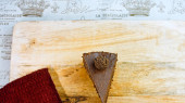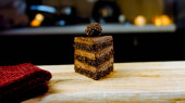 Kawałek ciasta ferrero z czekoladą. Strzelanie makro i suwakiem. W tle panuje atmosfera retro.