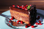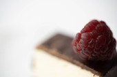 Kawałek ciasta truskawkowego i galaretkowego z gałązką porzeczki. Strzelanie makro i suwakiem. W tle panuje atmosfera retro.